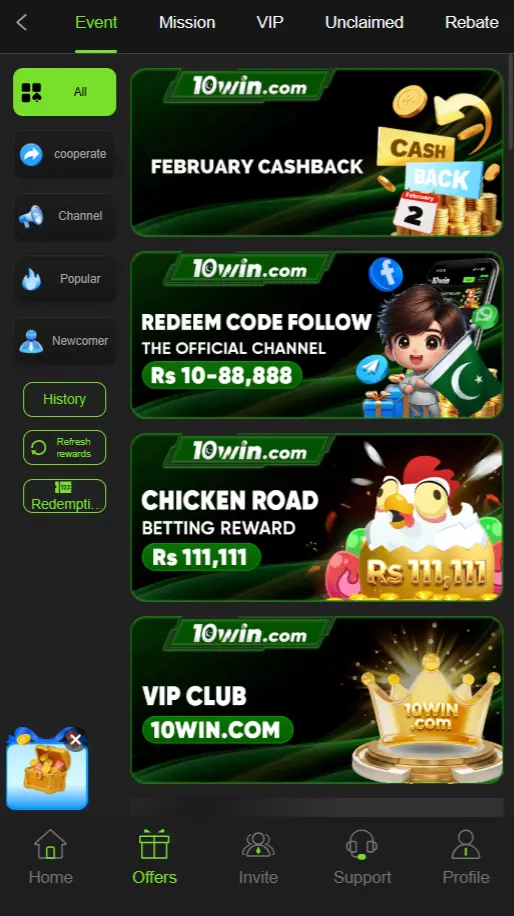 10win encourages users to invite friends. When someone registers using your referral link and starts playing, you receive a bonus.
